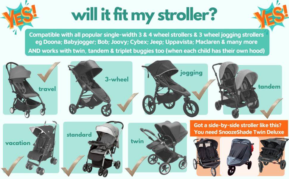 Will it fit my stroller? Yes! SnoozeShades are all universally sized and fit all single-width strollers with a hood, including jogging strollers. We’ve even seen them used on bike trailers and festival trolleys! You don’t need to worry about the type of pushchair you have – simply choose the SnoozeShade that suits the age of your child.