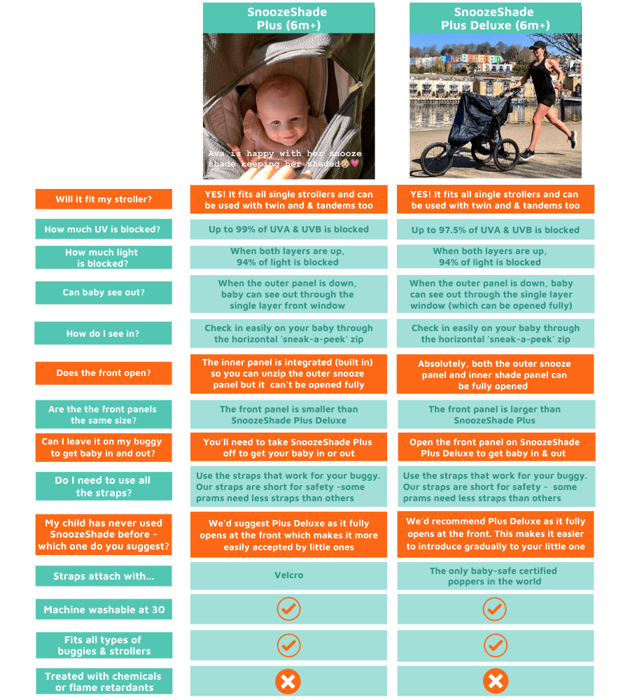 What age is it for? We recommend SnoozeShade Plus for babies from six months, because it’s proportioned to fit strollers when your little one is sitting up. If you’re looking for a SnoozeShade for a smaller baby in a carrycot, you’ll find SnoozeShade Original is a better fit. You can continue using SnoozeShade Plus as long as your child is in their stroller. Our founder, Cara, still used hers occasionally when her daughter was five!